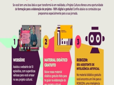 Governo de Minas e Cemig incentivam projeto que promove formação gratuita para agentes culturais Com o objetivo de contribuir para a capacitação de agentes culturais, incentivando o desenvolvimento e a proposição de projetos na Lei Estadual de Incentivo à Cultura (Leic) de Minas Gerais, o Governo de Minas, por meio da Secretaria de Estado de Cultura e Turismo (Secult), e a Cemig estão incentivando o Projeta Cultura, iniciativa que v...