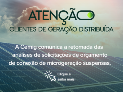 Cemig D retoma análises de solicitações de orçamentos de conexão de microgeração distribuída A Cemig Distribuição (Cemig D) informa que retomou desde 26/04/2023 as análises de solicitações de orçamentos de conexão de microgeração distribuída que estavam suspensas em razão de consultas ao Operador Nacional do Sistema Elétrico– ONS. A previsão de conclusão de todas essas análises é até o dia 06/08/2023.