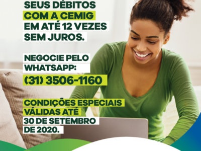 Atenção: últimos dias para negociar débitos junto à Cemig com condições especiais Clientes da Cemig com alguma pendência tem até o próximo dia 30 de setembro para aderir a Campanha de Negociação de Débitos da companhia. A empresa está oferecendo condições facilitadas para o acerto das pendências, como o parcelamento da dívida em até 12 vezes sem juros. Para aproveitar o benefício, basta que os interessados atua...