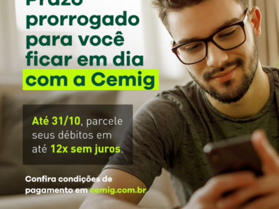 Atenção: Cemig prorroga campanha de negociação de débitos com condições especiais A Cemig prorrogou até o dia 31 de outubro a Campanha de Negociação de Débitos para que clientes com alguma pendência financeira com a companhia quitem suas dívidas com condições especiais. Dessa forma, a empresa está oferecendo condições facilitadas para o acerto das pendências, como o parcelamento da dívida em até 12 vezes sem j...