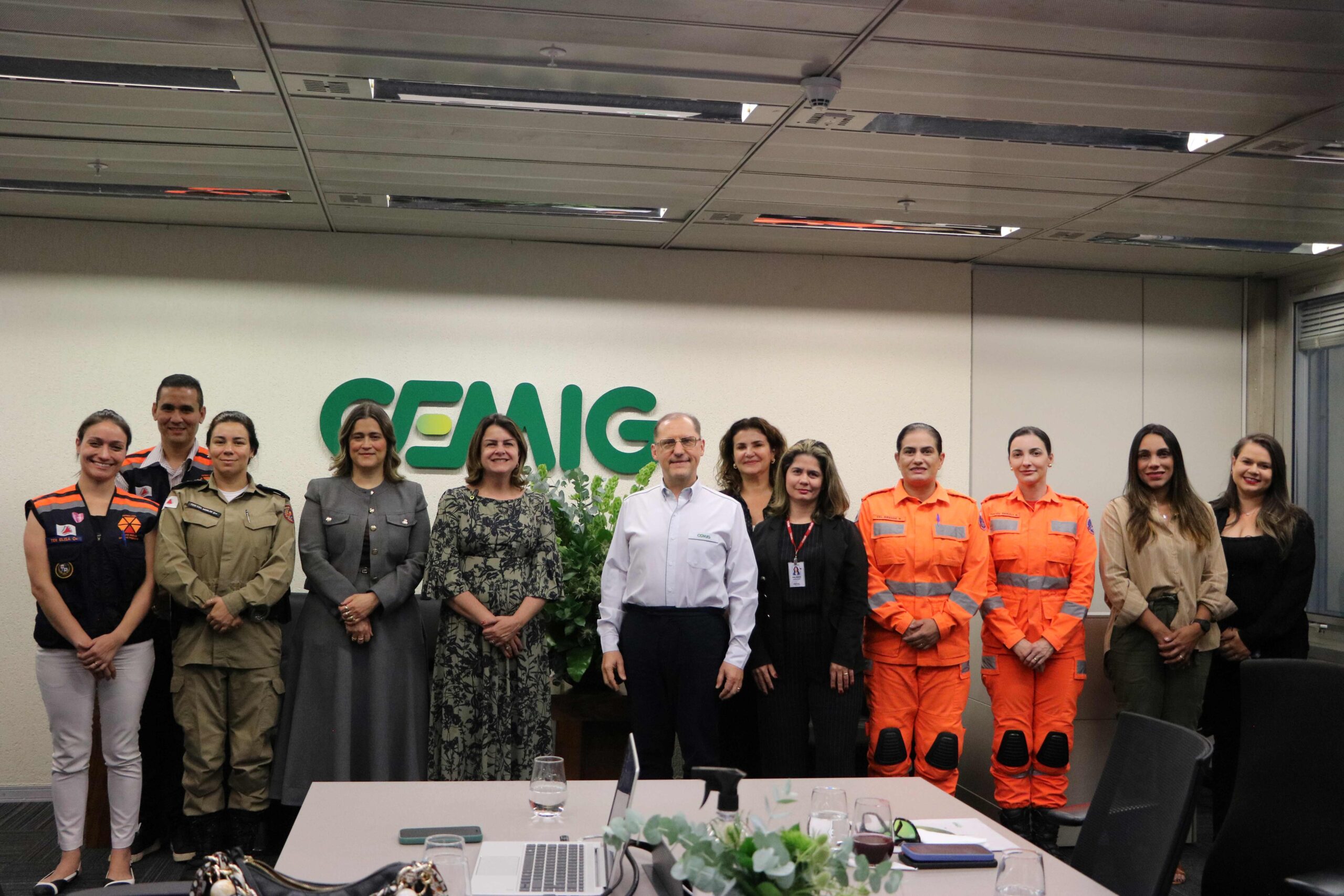 Legenda: O encontro entre a Cemig e o Servas marcou o apoio da companhia à instituição, que aportou este ano R$1 milhão em apoio às famílias atingidas por chuvas intensas e secas. Na foto, o presidente da Cemig, Reynaldo Passanezi Filho, e a presidente do Servas, Christiana Renault, juntamente com representantes das forças de segurança estaduais, MPMG e Sedese.