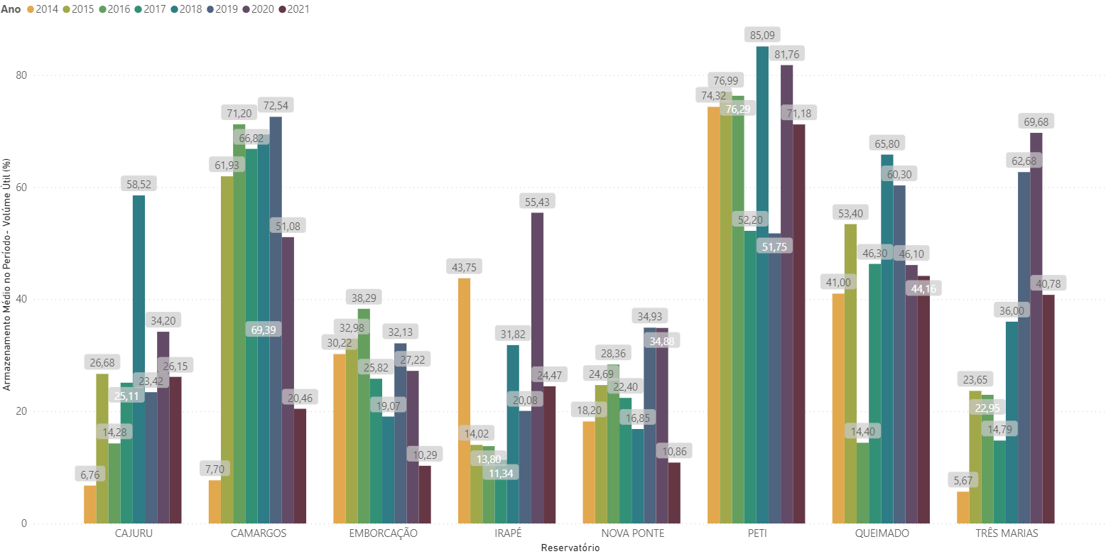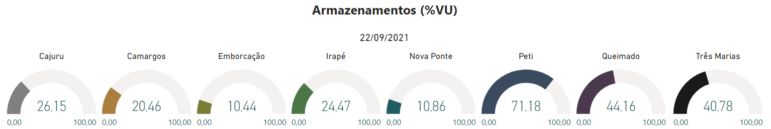 O volume dos 8 principais reservatórios operados pela Cemig em 22 de setembro está exibido a seguir. Dentre estes reservatórios, Camargos, Emborcação, Irapé, Nova Ponte, Queimado e Três Marias são reservatórios de Usinas Hidrelétricas despachadas em conjunto com o Operador Nacional do Sistema, ONS. São exibidos também os armazenamentos de duas Pequenas Centrais Hidrelétricas (PCH) operadas pela Cemig, Cajuru e Peti, que também possuem reservatórios de acumulação.