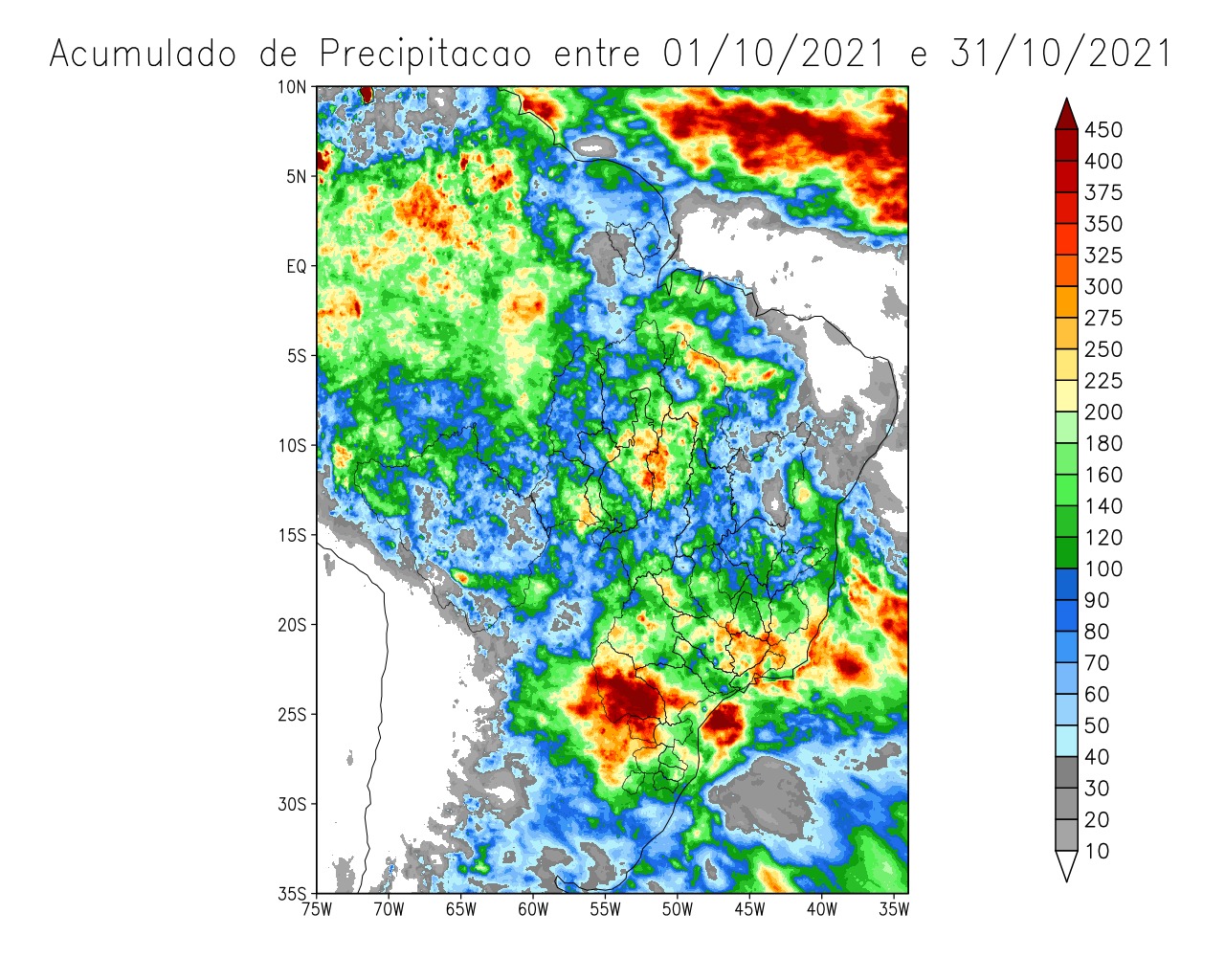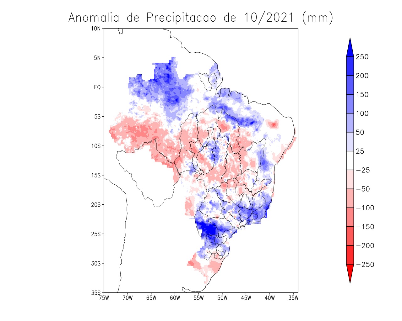 Os gráficos a seguir apresentam o acumulado de precipitação (mm) para o mês de outubro, e a análise do verificado em relação à climatologia (média histórica). Este segundo gráfico é conhecido como anomalia de precipitação, sendo que as regiões com tonalidades azuis indicam valores superiores à média histórica, enquanto os tons vermelhos representam chuvas abaixo da média.