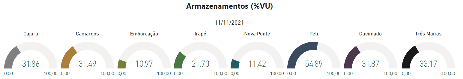 O volume dos 8 principais reservatórios operados pela Cemig em 11 de novembro está exibido a seguir. Dentre estes reservatórios, Camargos, Emborcação, Irapé, Nova Ponte, Queimado e Três Marias são reservatórios de Usinas Hidrelétricas despachadas em conjunto com o Operador Nacional do Sistemas, ONS. São exibidos também os armazenamentos de duas Pequenas Centrais Hidrelétricas (PCH) operadas pela Cemig, Cajuru e Peti, que também possuem reservatórios de acumulação.